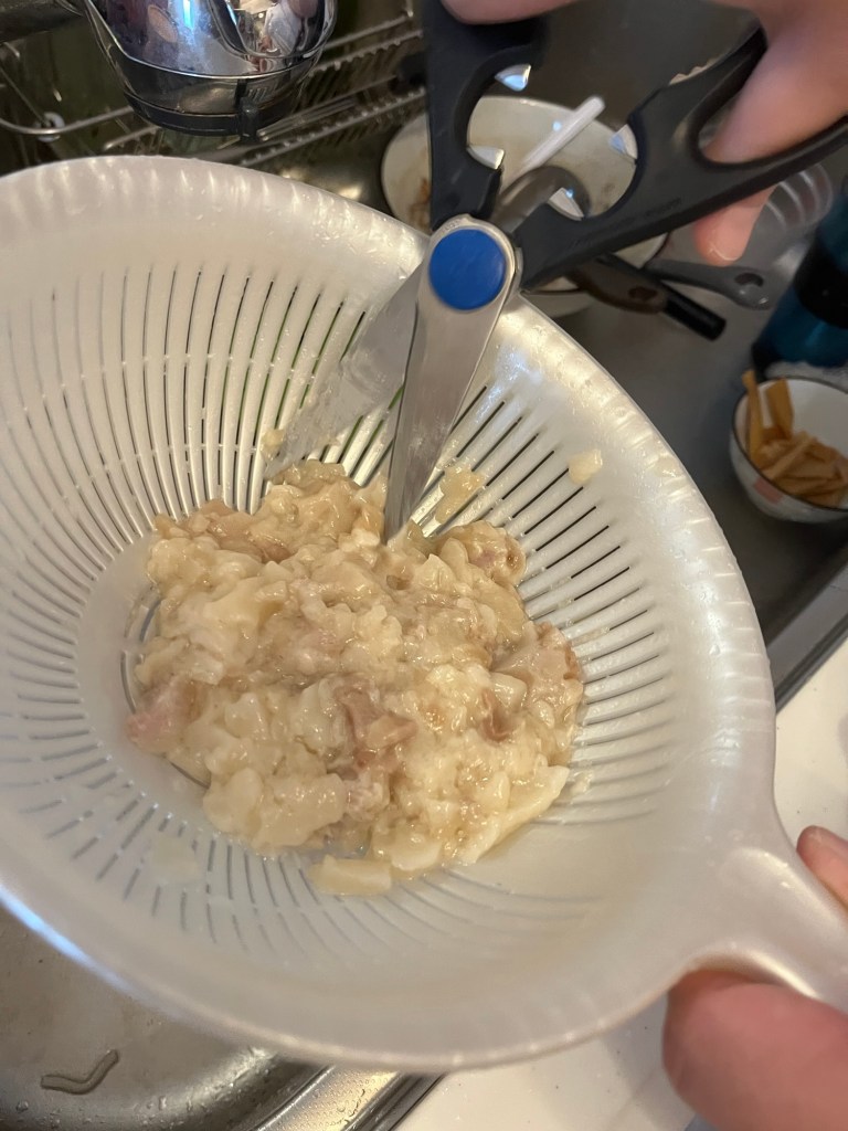 ザルにあげ、キッチンハサミでチョキチョキしました。