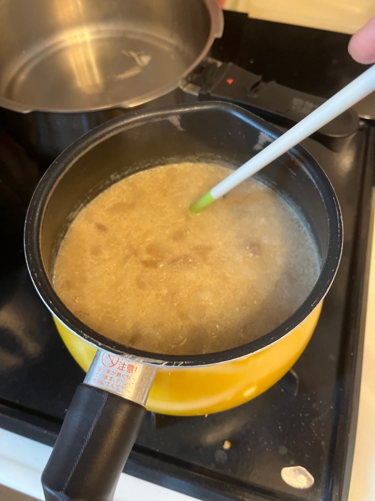 次は、同じスープベースに味噌を大さじ4杯入れました!うちはコストコの円熟味噌ですが、ダシ入ってない味噌なら、お好きな味噌で良いと思います。赤味噌もあうと思います。